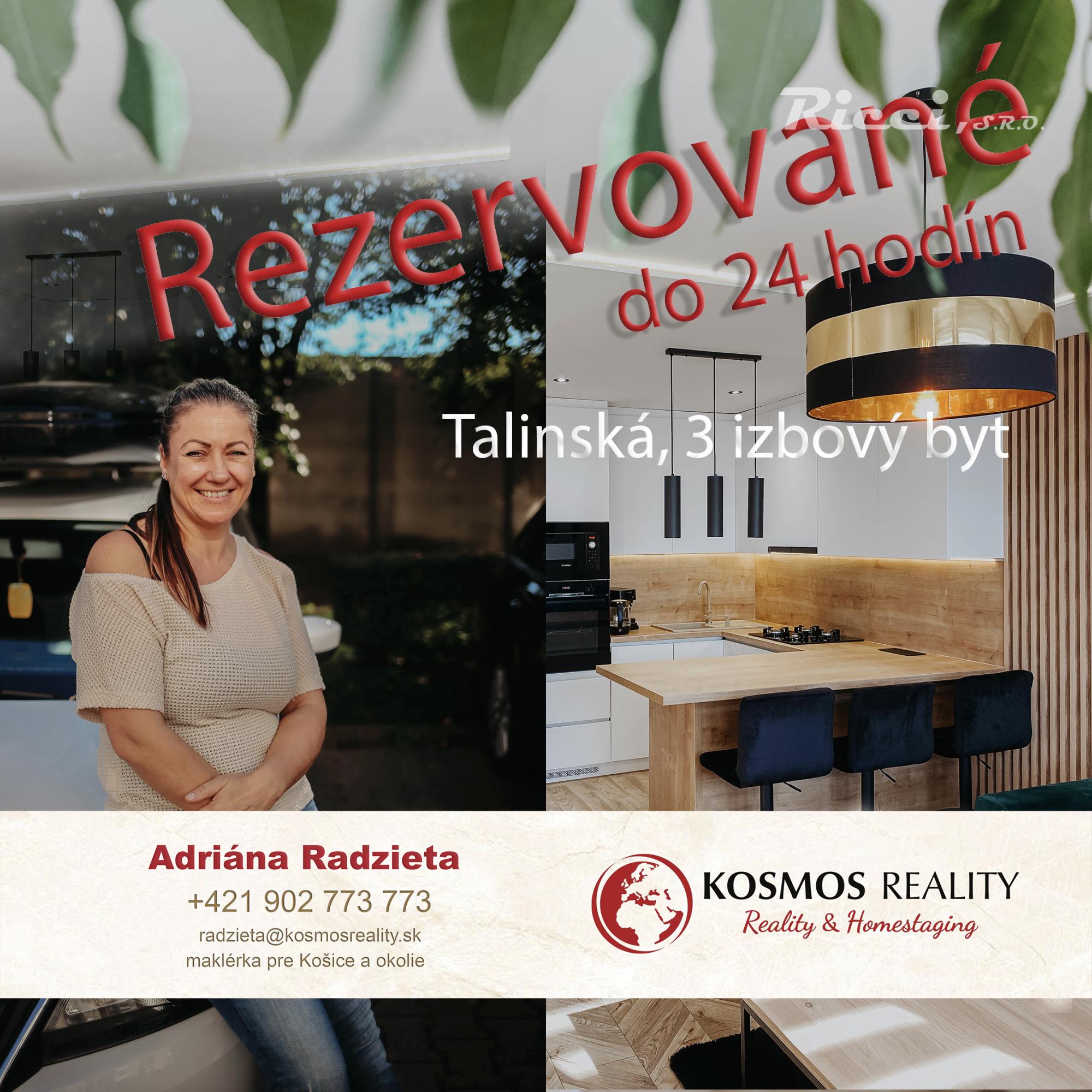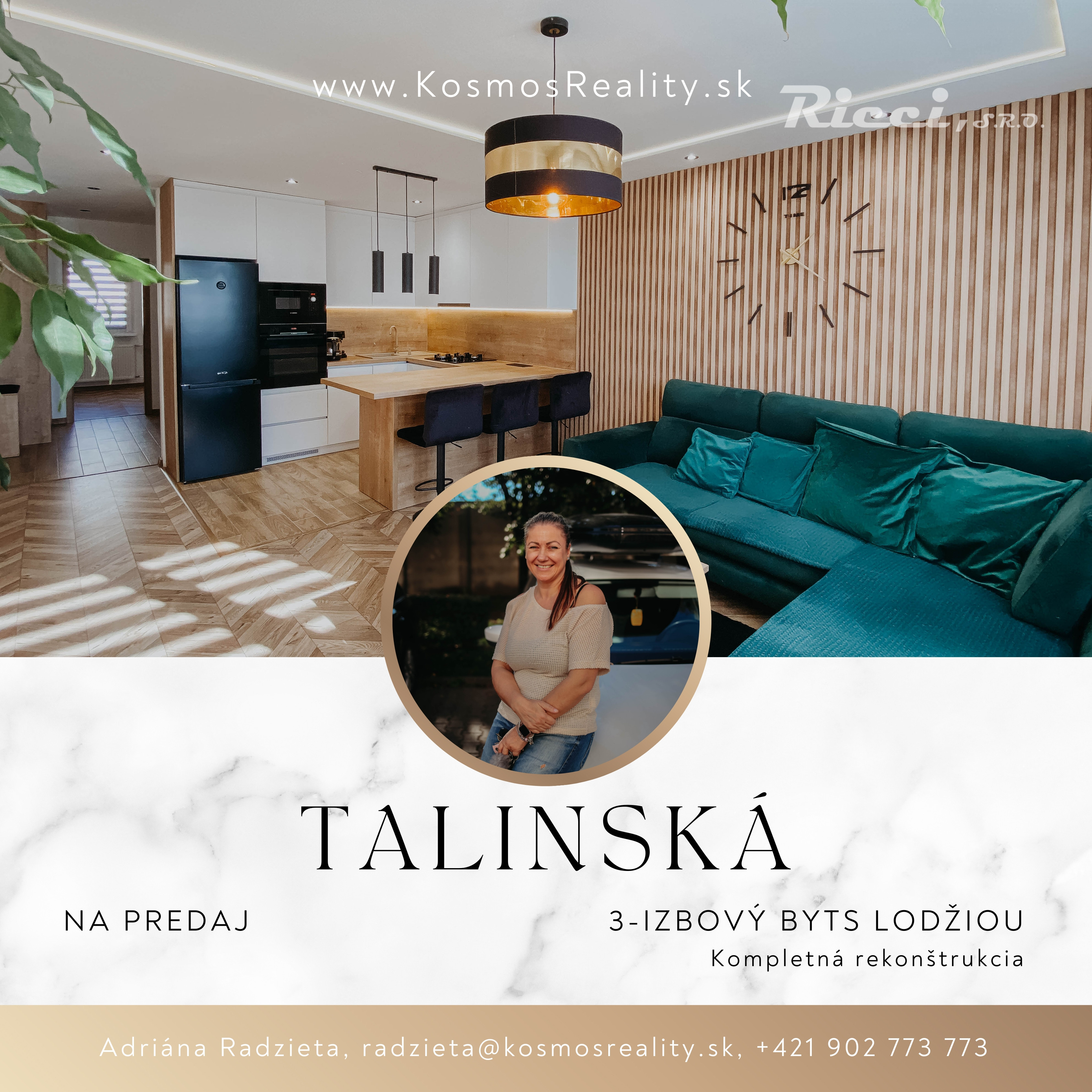 na predaj krásny, príjemný kompletne zrekonštruovaný 3i byt na ulici Talinská v lokalite Košice Nad Jazerom. Byt je o výmere 60m2 a k bytu prislúcha aj pivnica. Byt má aj loggiu. Orientácia byte je: juhovýchod (obývačka prepojená s kuchyňou a spálňa s výstupom na loggiu), severozápad (detská izba). Byt sa nachádza na ideálnom 4. poschodí z 8.