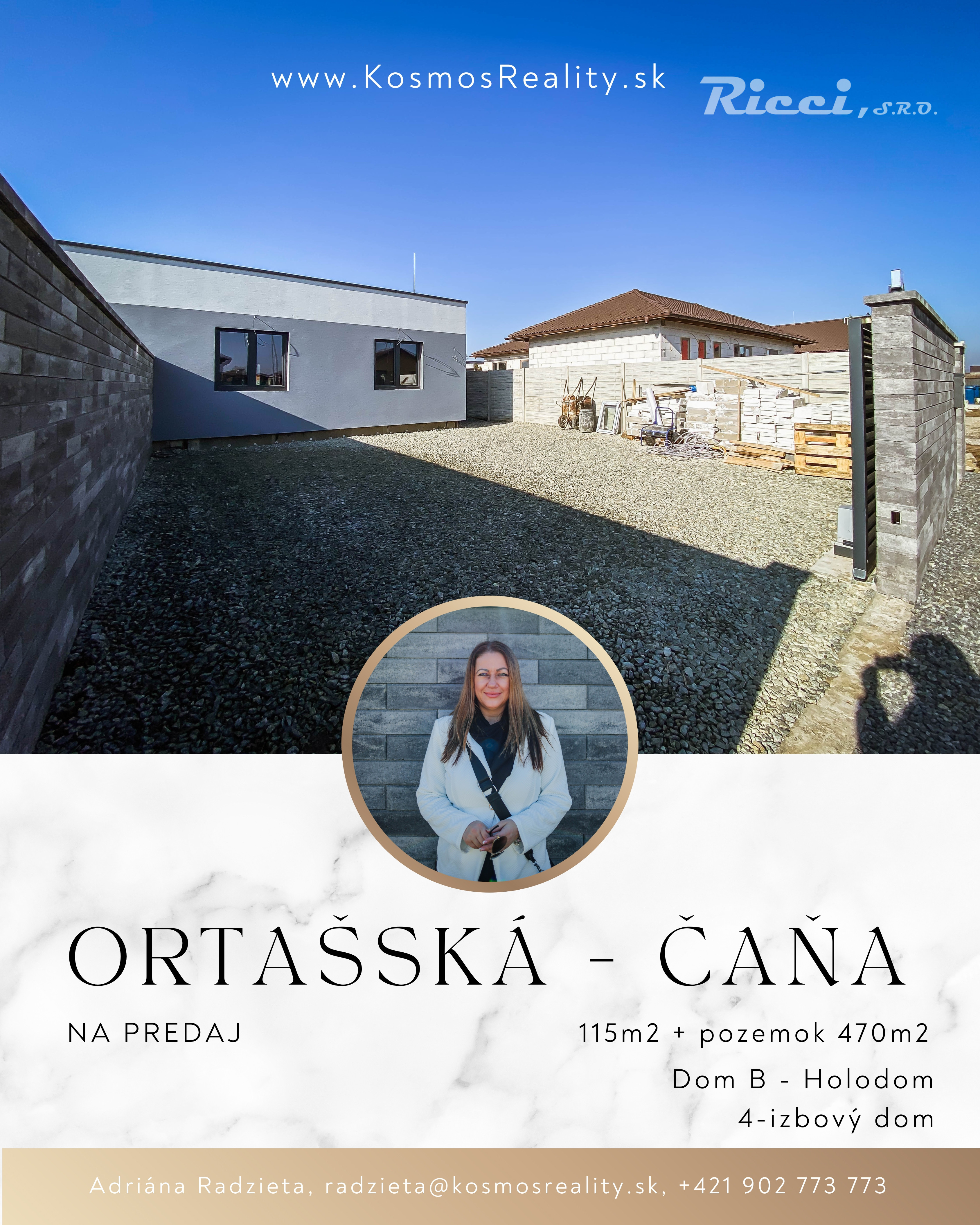 na predaj novostavbu rodinného domu v stave holodomu v obci Čaňa na ulici Ortášska. Dom sa nachádza v novej lokalite obce a je na pozemku o výmere 470m2. Dom má úžitkovú plochu cca 115m2 a jedná sa o 4i bungalov.